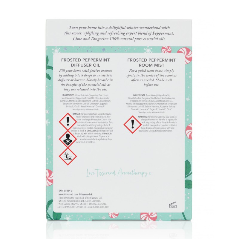 | Veiligheid | Frosted Peppermint Room Mist: For external use only. May cause an allergic skin reaction. Harmful to aquatic life with long lasting effects. If medical advice is needed, have product container or label at hand. Dispose of in accordance with local regulations. Keep out of reach of children. Frosted Peppermint Diffuser Oil: For external/diffuser use only. May be fatal if swallowed and enters airways. May cause an allergic skin reaction. Causes skin irritation. Causes serious eye irritation. Toxic to aquatic life with long lasting effects. If medical advice is needed, have product container or label at hand. Dispose of in accordance with local regulations. Keep out of reach of children. |